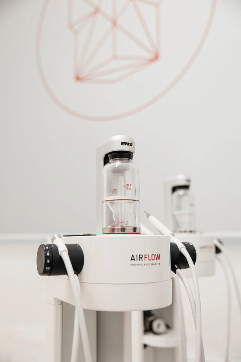 Проводит процедуру гигиенической чистки на аппарате EMS AIRFLOW Prophylaxis Master (Швейцария) — новейшей разработке в области профилактической стоматологии.